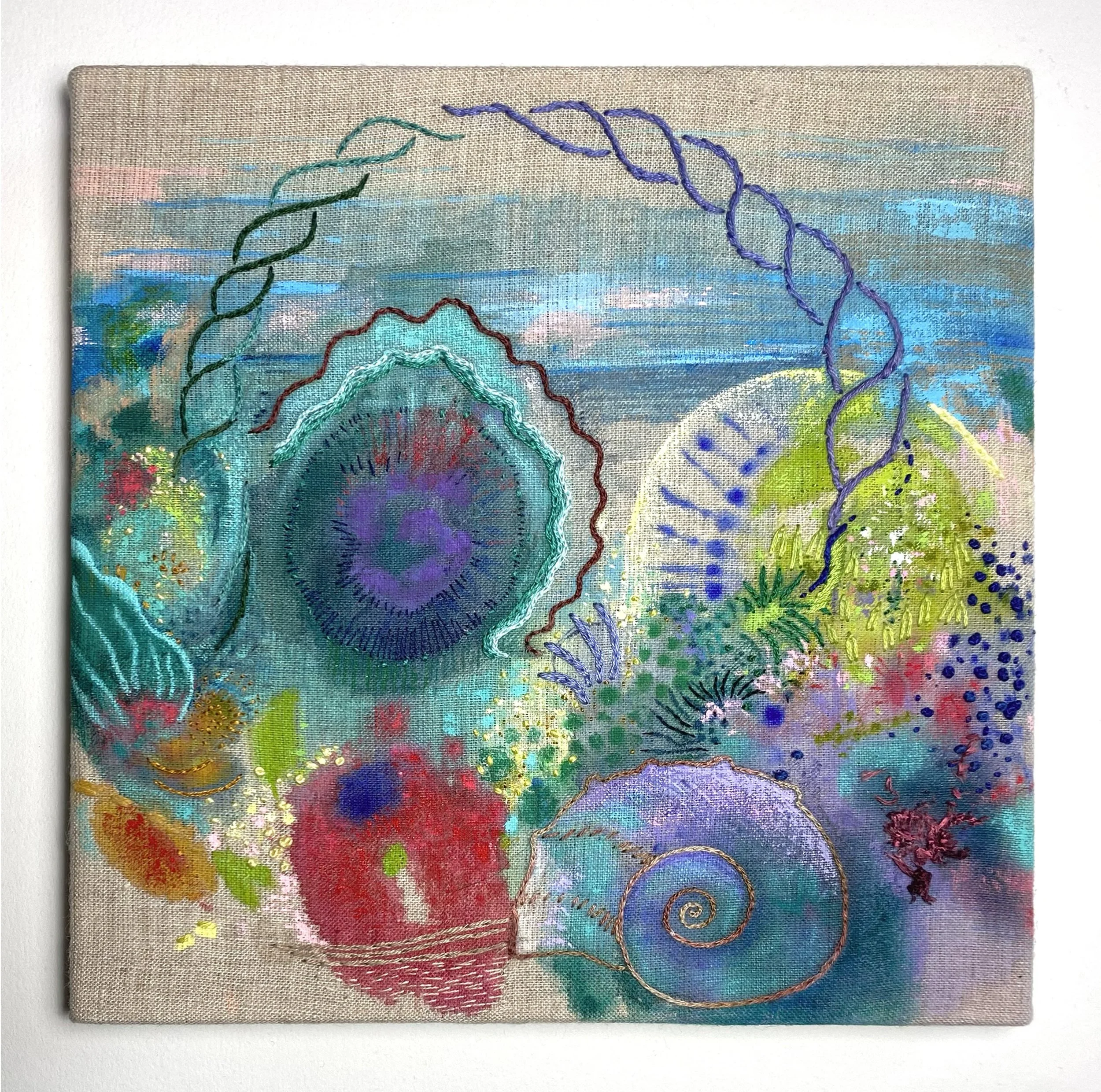 Heidi Leitzke, Spiral-Season, acrylic and thread on linen, 8x8 inches, 2025